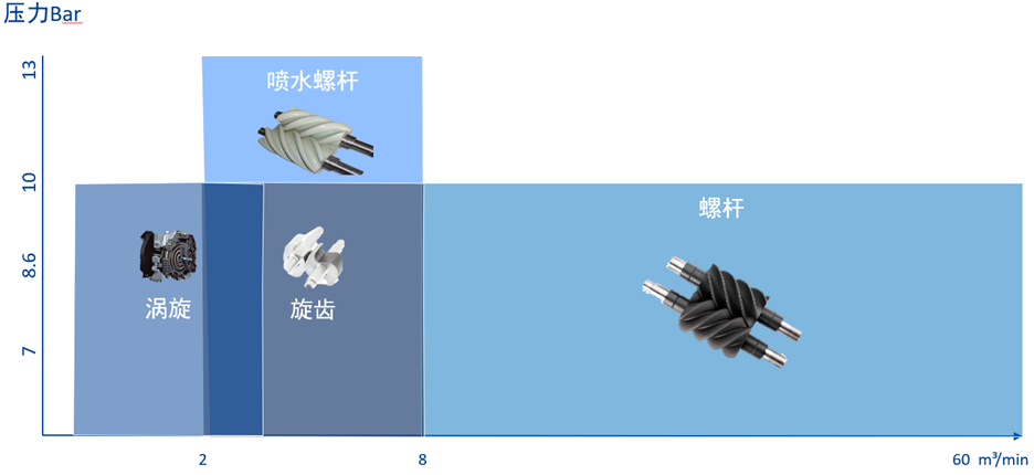 所以针对电子,食品,饮料,医疗等行业推荐干式无油系列压缩机组成的空气系统可从源头上提供满足ISO 8573-1:2010气体品质等级标准中对含油量0级的要求。那么不同的无油压缩空气需求应该如何选择呢,对比了各种干式无油系列压缩机的能耗与可靠性后推荐在如下,在<2m³/min的流量范围,推荐使用无油涡旋;在2~8m³/min 范围内推荐使用无油旋齿;≥8m³/min推荐使用无油螺杆;详细可参考下表结合压力选择对应产品。